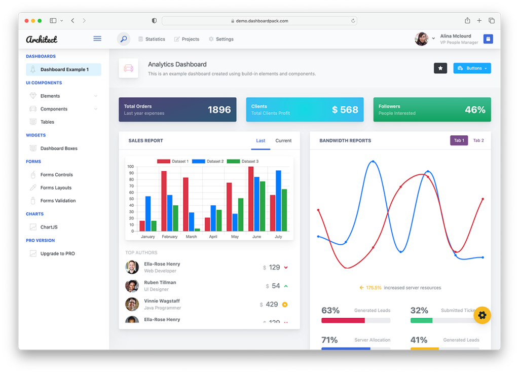 ArchitectUI is a clean and minimal admin panel for many use cases. It has all the necessary features like graphics, forms, tables, and more. For even more elements, you can use the premium version of this template.