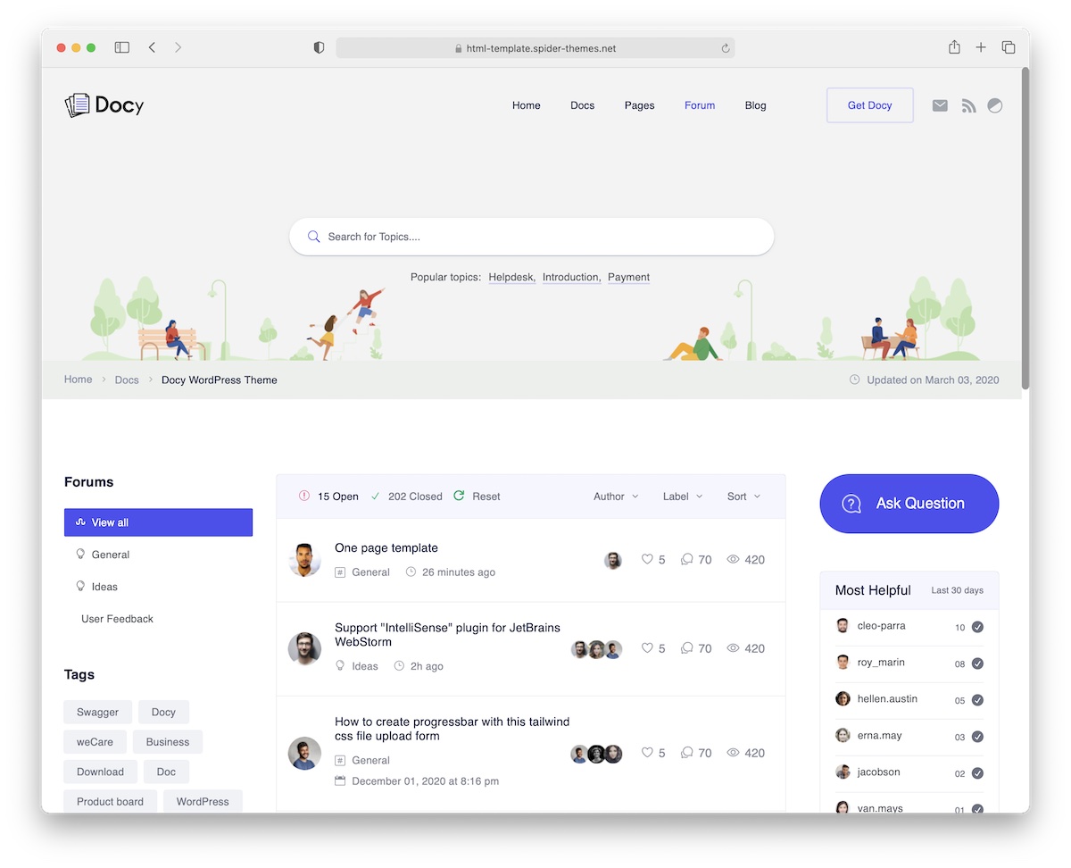 Anyhow, meet Docly. This top-class Bootstrap forum template for WordPress is great for online documentation and knowledge base. It comes with the easy-to-use bbPress helpdesk forum that any user can benefit from easily.