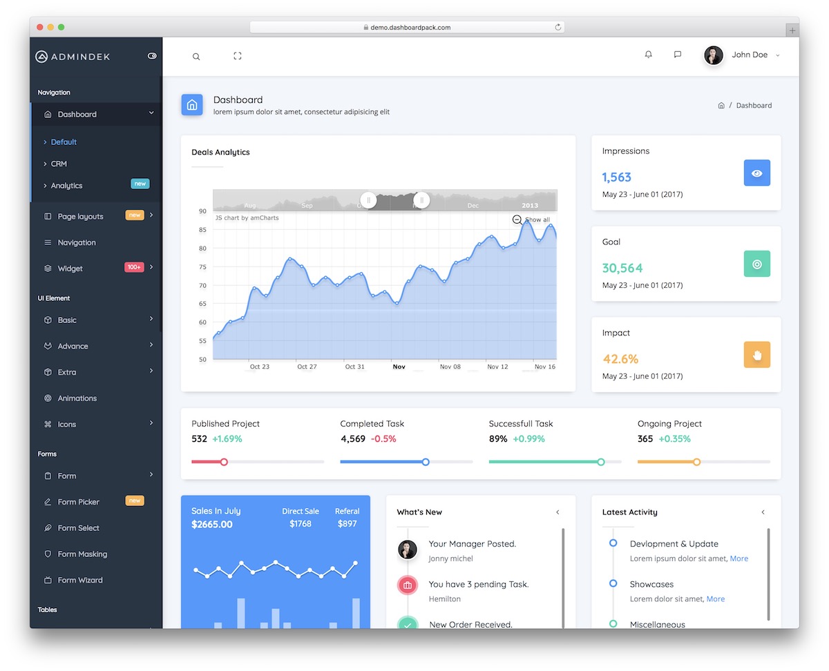 Admindek is a complete jQuery and Bootstrap 5 admin panel with 100s components, different demos and many color skins.